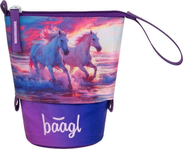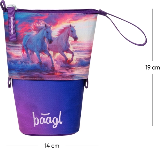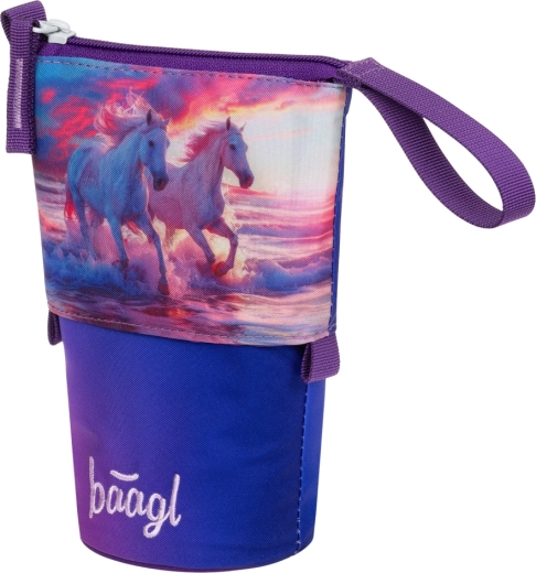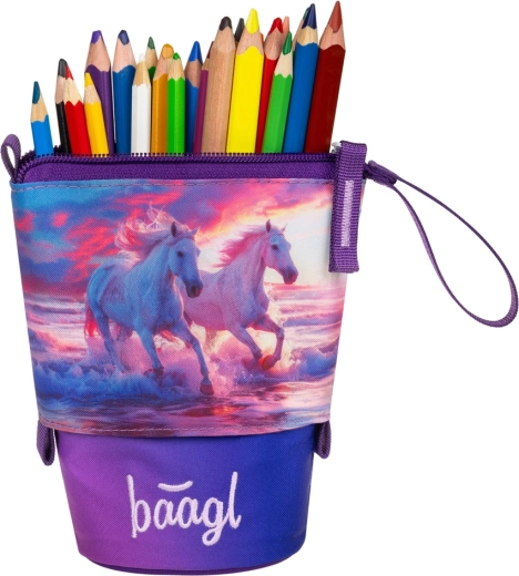 Stylový a odolný penál Pastelkovník od Baagl s motivem Koně Srdce nabízí chytré uspořádání psacích potřeb a funkci stojánku na stůl jedním tahem. Vyroben z pevného voděodolného materiálu, spolehlivě chrání obsah, má tajnou vnitřní kapsu na drobnosti a díky certifikaci GRS obsahuje minimálně 50 % recyklovaných materiálů.