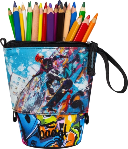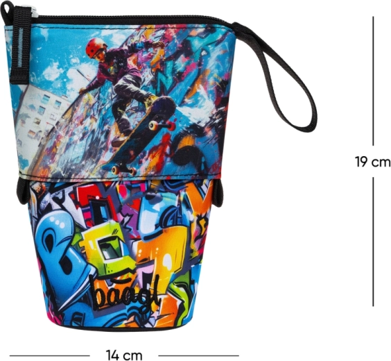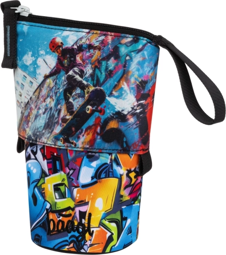 Pastelkovník je zodpovědně vyrobený a nese certifikaci Global Recycled Standard (GRS), což potvrzuje použití minimálně 50 % recyklovaných materiálů a splnění vysokých sociálních i ekologických požadavků. Spojuje udržitelnost, funkčnost a atraktivní graffiti design se skateboarderem.
