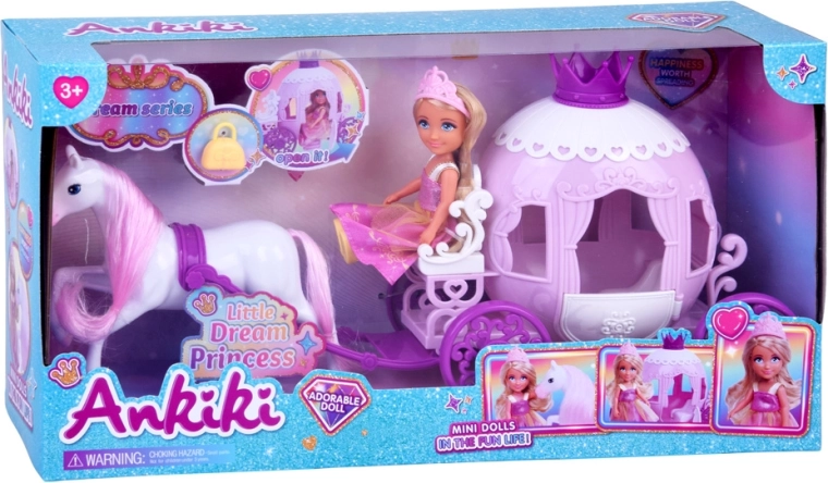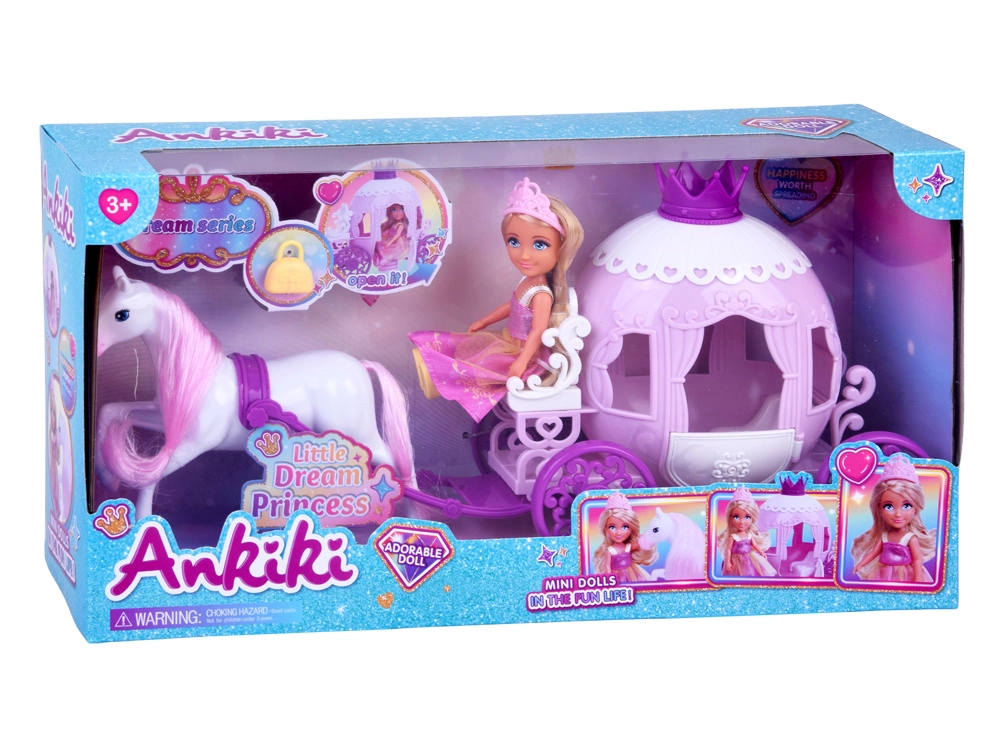 Tato půvabná sada přináší vše pro kouzelnou jízdu do říše fantazie: malou princeznu v růžových šatech s korunkou, zdobený kočár s korunkou a srdíčkovými detaily a bílého koně s růžovou hřívou a ocasem. Díky kompaktním rozměrům si ji děti snadno vezmou kamkoli s sebou.