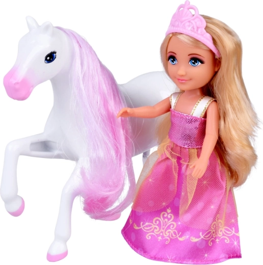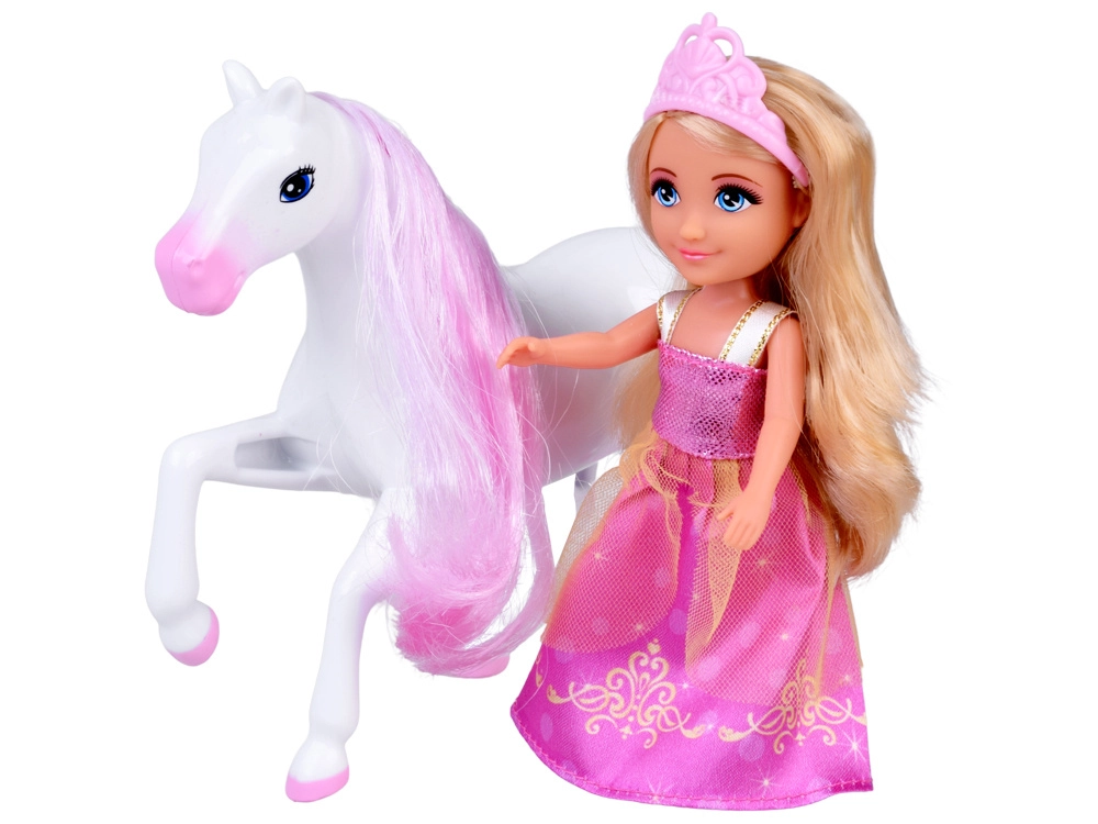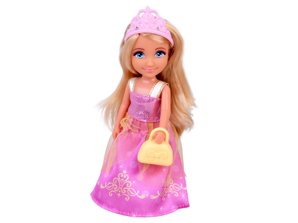 Panenka s dlouhými blond vlasy, růžovou korunkou a třpytivými šaty. Ideální pro hraní rolí – od královských návštěv po plesy v paláci.