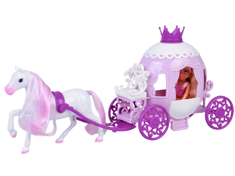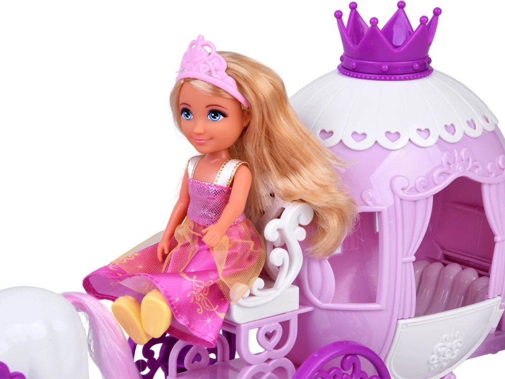 Zdobený růžovo‑bílý kočár s korunkou a dekorativními koly přináší do hry opravdovou pohádkovou atmosféru. Kolečka se volně točí a kočár lze táhnout za koně.