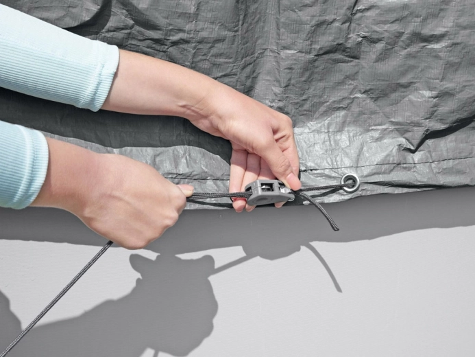 Díky povrchové úpravě Polar‑Shield je plachta vhodná pro celoroční použití a zachovává své vlastnosti i v mrazech až do −25 °C. Větruodolný stahovací mechanismus drží plachtu pevně na místě a minimalizuje riziko nadzvednutí větrem.