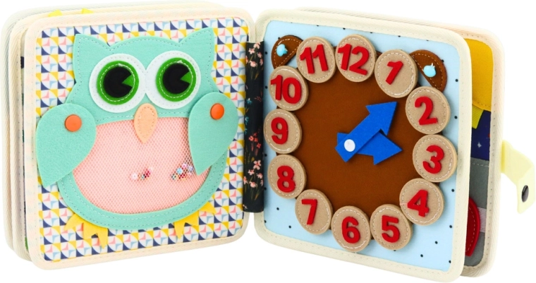Uvnitř najdete pestré smyslové úkoly – od přiřazování tvarů a ovoce až po hodinový ciferník s otočnými ručičkami, který hravou formou přibližuje učení času. Kompaktní rozměry z ní dělají ideálního společníka do autobusu, auta i letadla.