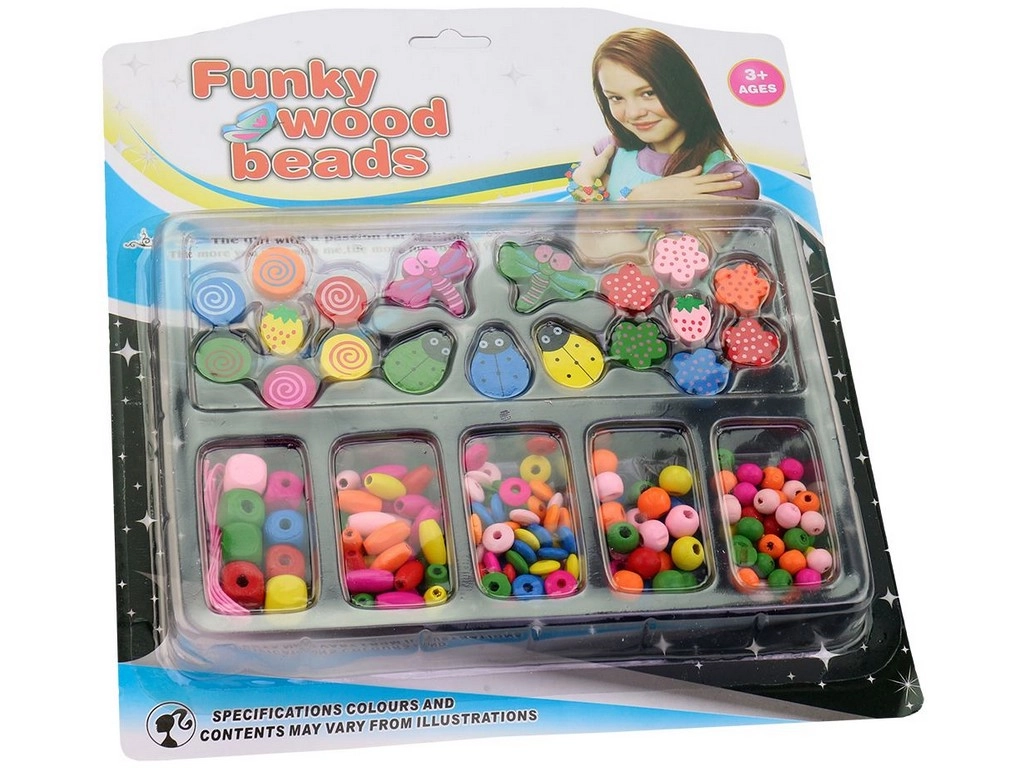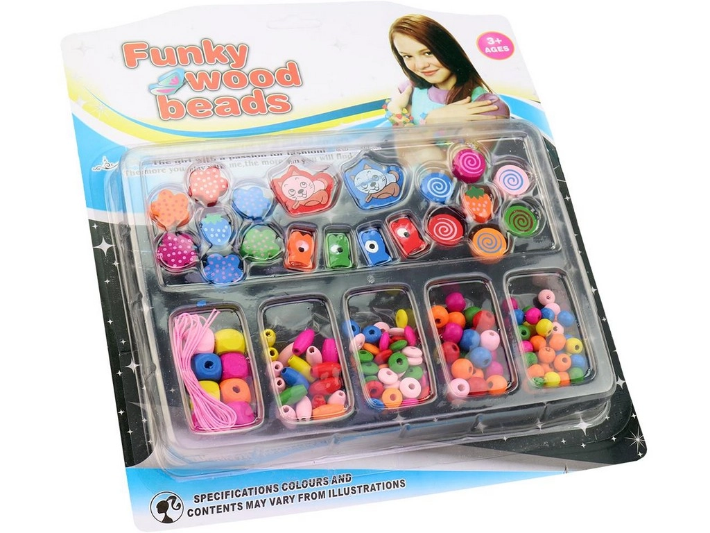 Kreativní sada dřevěných korálků v mnoha tvarech a barvách pro snadné navlékání a tvorbu originálních šperků. Ideální pro rozvoj jemné motoriky, fantazie a trpělivosti. Balení na blister kartě, rozměr 25 × 28 cm, vhodné pro děti od 3 let.