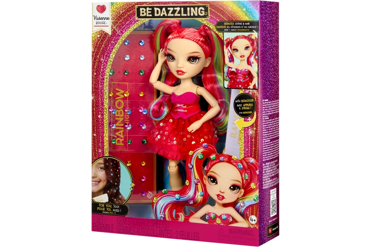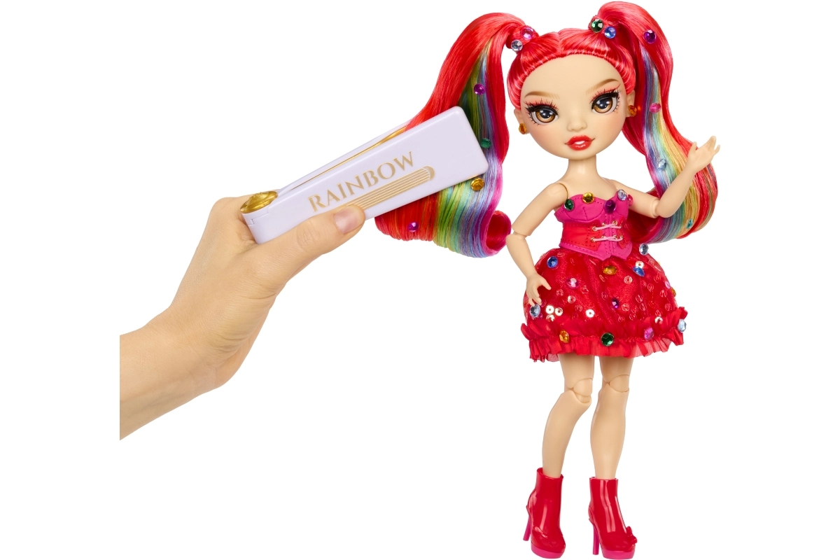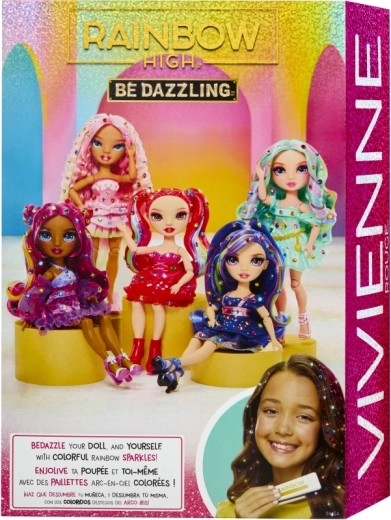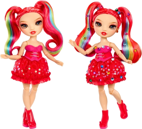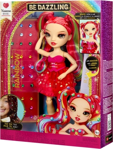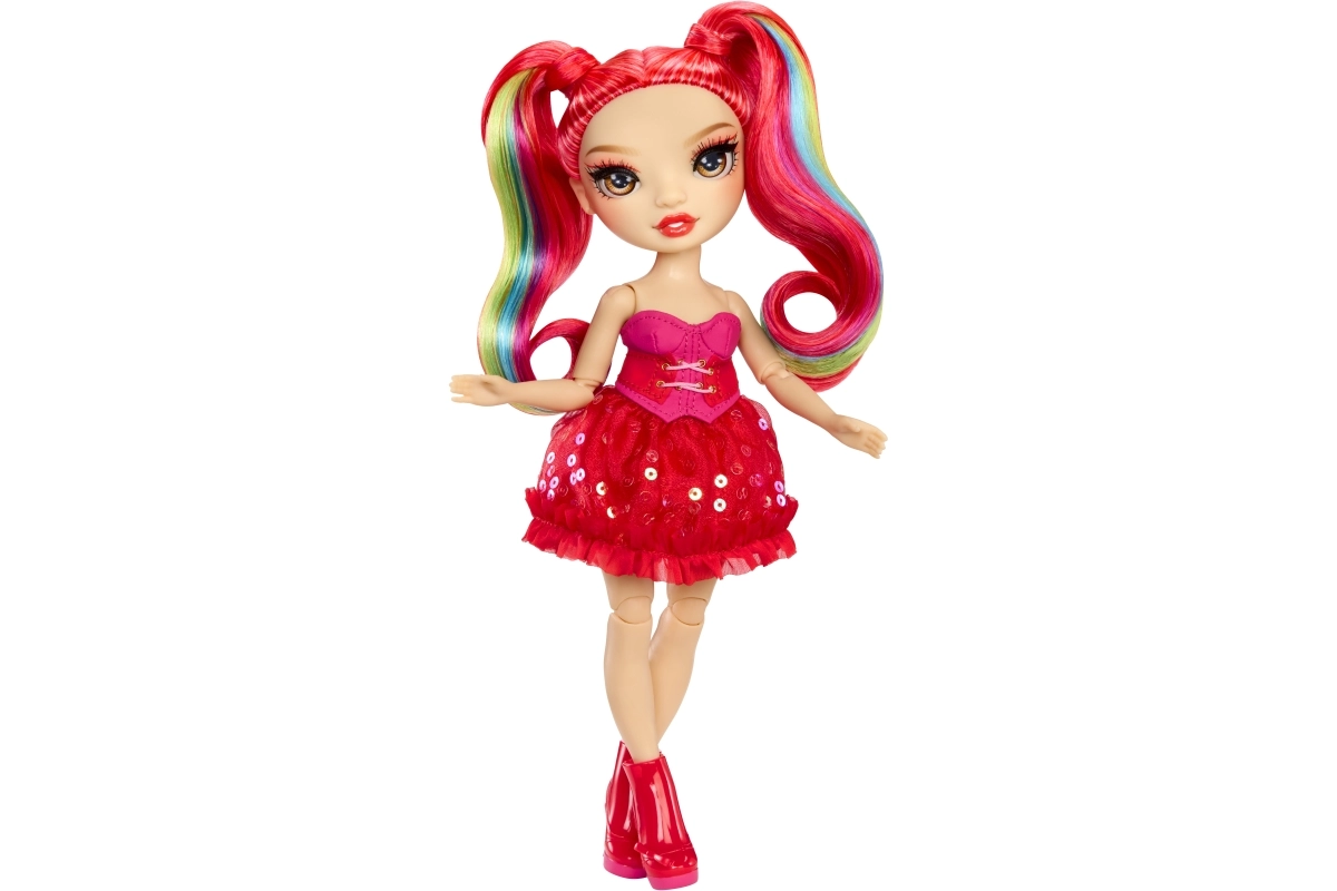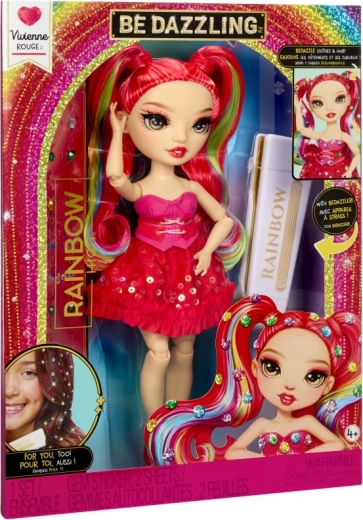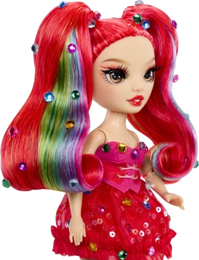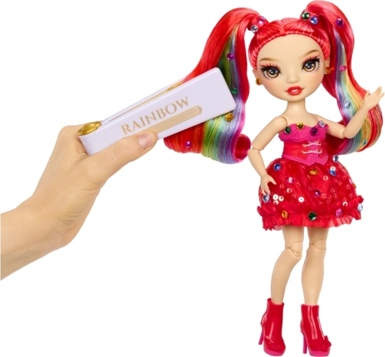 Panenka Rainbow High Vivienne Rouge přináší do tvé sbírky výraznou červenou energii a módu inspirovanou spektrem duhy. Její dlouhé česatelné vlasy s duhovými prameny, třpytivé šaty a ladící boty umožňují vytvářet působivé kombinace pro hraní i vystavení. Díky kloubům v pažích, nohách a hlavě ji snadno nastavíš do různých póz.