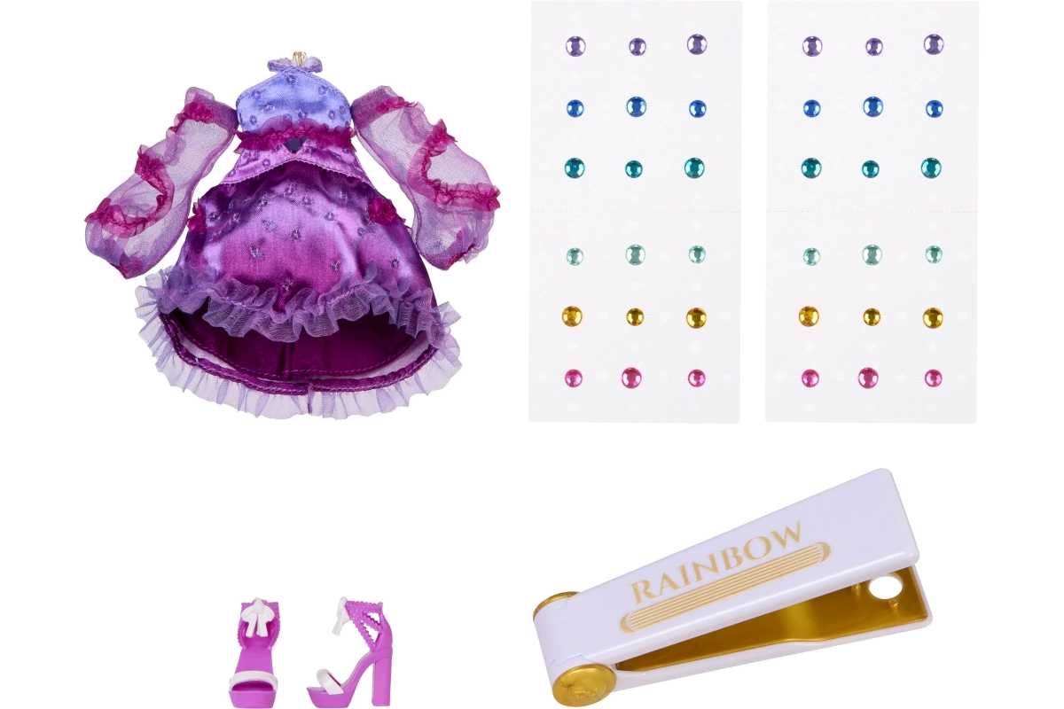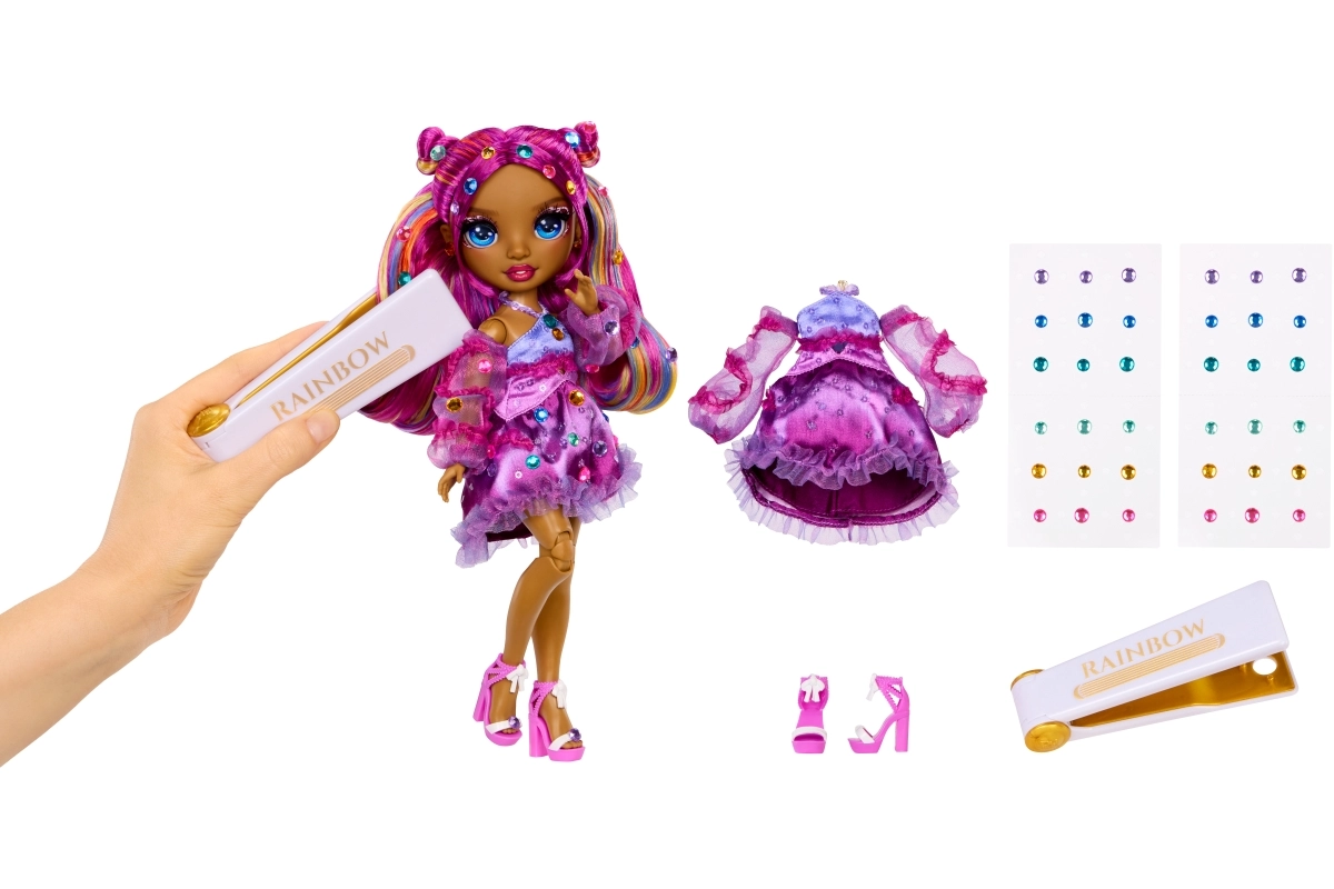 Součástí balení jsou duhové kamínky a krimpovací nástroj RAINBOW, se kterými snadno ozdobíš vlasy i šaty panenky – a můžeš je vyzkoušet i na sobě. Vytvářej originální účesy, kombinuj doplňky a rozvíjej fantazii i jemnou motoriku.