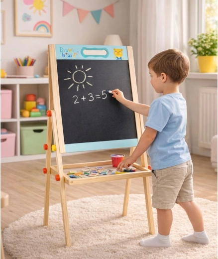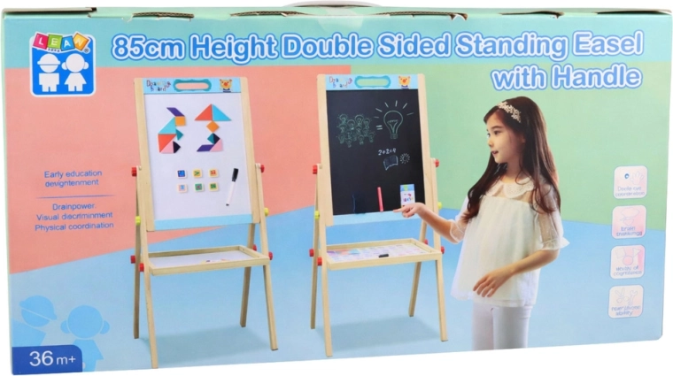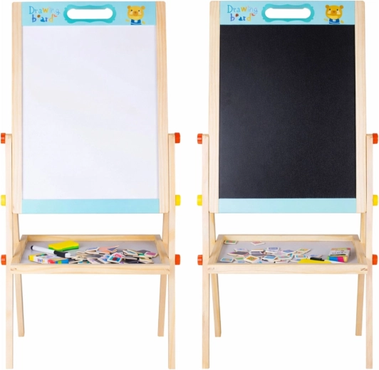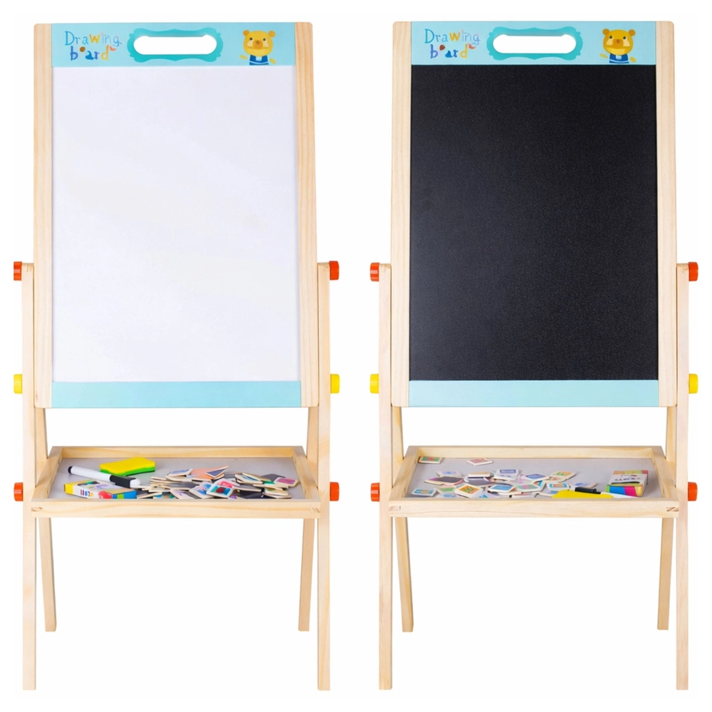 Tato oboustranná edukační tabule je skvělým pomocníkem pro učení hrou. Na bílé magnetické straně děti trénují psaní fixem a skládají slova a příklady z magnetických písmen, číslic a matematických znaků. Na černé straně mohou tvořit křídou a rozvíjet svou fantazii. Tabule je stabilní, má praktickou poličku na pomůcky a lze ji používat i bez nožek.
