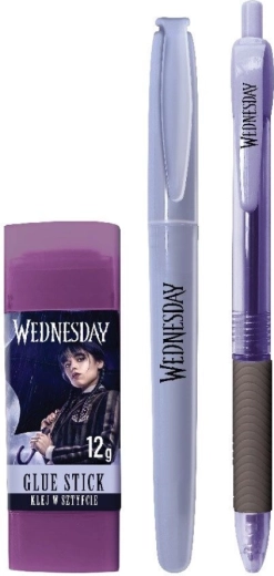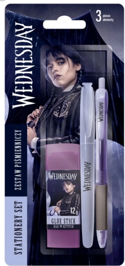 Stylová psací sada s motivem WEDNESDAY pro školu i kancelář. Obsahuje propisku s modrým inkoustem (hrot 0,5 mm), tenký liner pro přesné psaní (linka 0,4 mm) a zmizíkové lepidlo 8 g pro rychlé a čisté lepení.