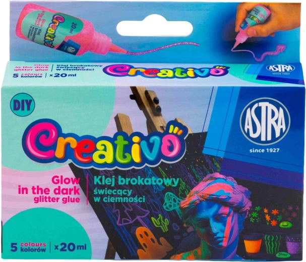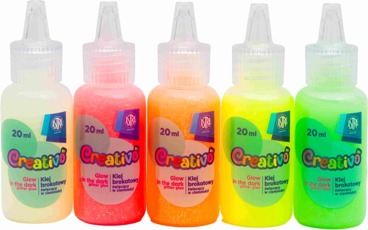 Sada ASTRA Creativo otevírá nový svět DIY tvoření pro děti i dospělé. Díky gelové konzistenci barvy skvěle drží tvar, vytvářejí trojrozměrné efekty a po zaschnutí se mění v svítící samolepky do tmy. Ideální pro zdobení pokojů, školních potřeb, dárků i sezónních dekorací.