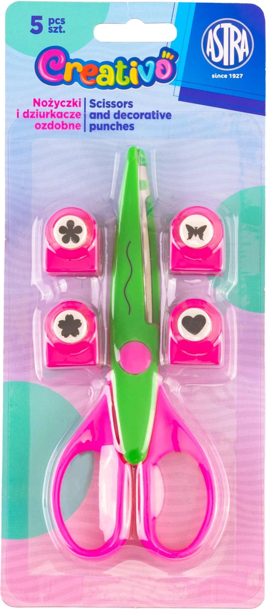 S touto univerzální sadou ASTRA Creativo rozvinete fantazii při domácím tvoření, ve škole i v dílně. Ozdobné nůžky s vlnkovým vzorem a čtyři motivové děrovačky (10 mm) vám pomohou rychle a čistě vytvářet okraje, výřezy a detaily pro jedinečné projekty.