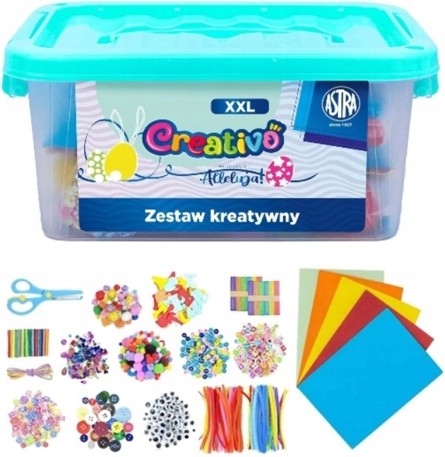 Objevte nekonečné možnosti tvoření s Astra Creativo sadou XXXL Velikonoce obsahující 2000 ks materiálů pro děti i dospělé. V jednom praktickém boxu najdete pěnová písmena, korálky, flitry, knoflíky, filc, bambulky, tvořivá dřívka, plastové oči, barevné papíry a další pomůcky – ideální pro jarní a velikonoční dekorace, školní projekty i domácí dílnu.