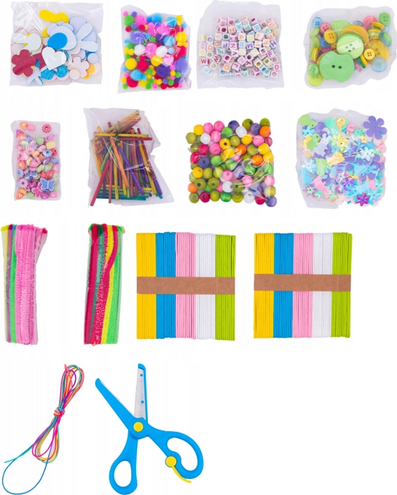- Pěnová písmena, plastové korálky, dřevěné korálky, PVC flitry, knoflíky, tvořivá dřívka, dřívka podobná zápalkám, plastové oči, bambulky, filc, elastická šňůrka, barevné archy papíru, nůžky, návod, plastový box