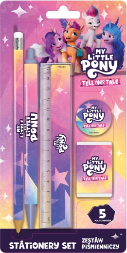 Zábavná a praktická psací souprava pro děti s oblíbeným motivem MY LITTLE PONY. Ideální do školy i na doma – obsahuje vše potřebné pro psaní a kreslení: pravítko 15 cm, gumu, ořezávátko a 2 tužky HB.