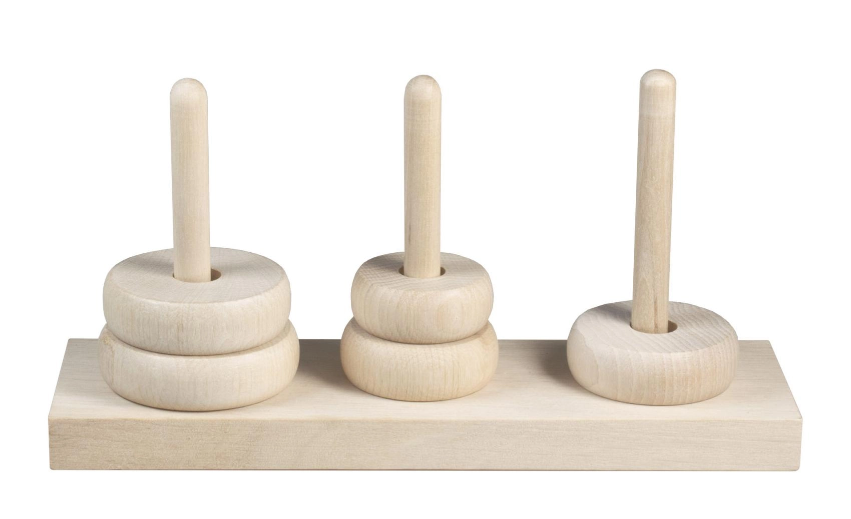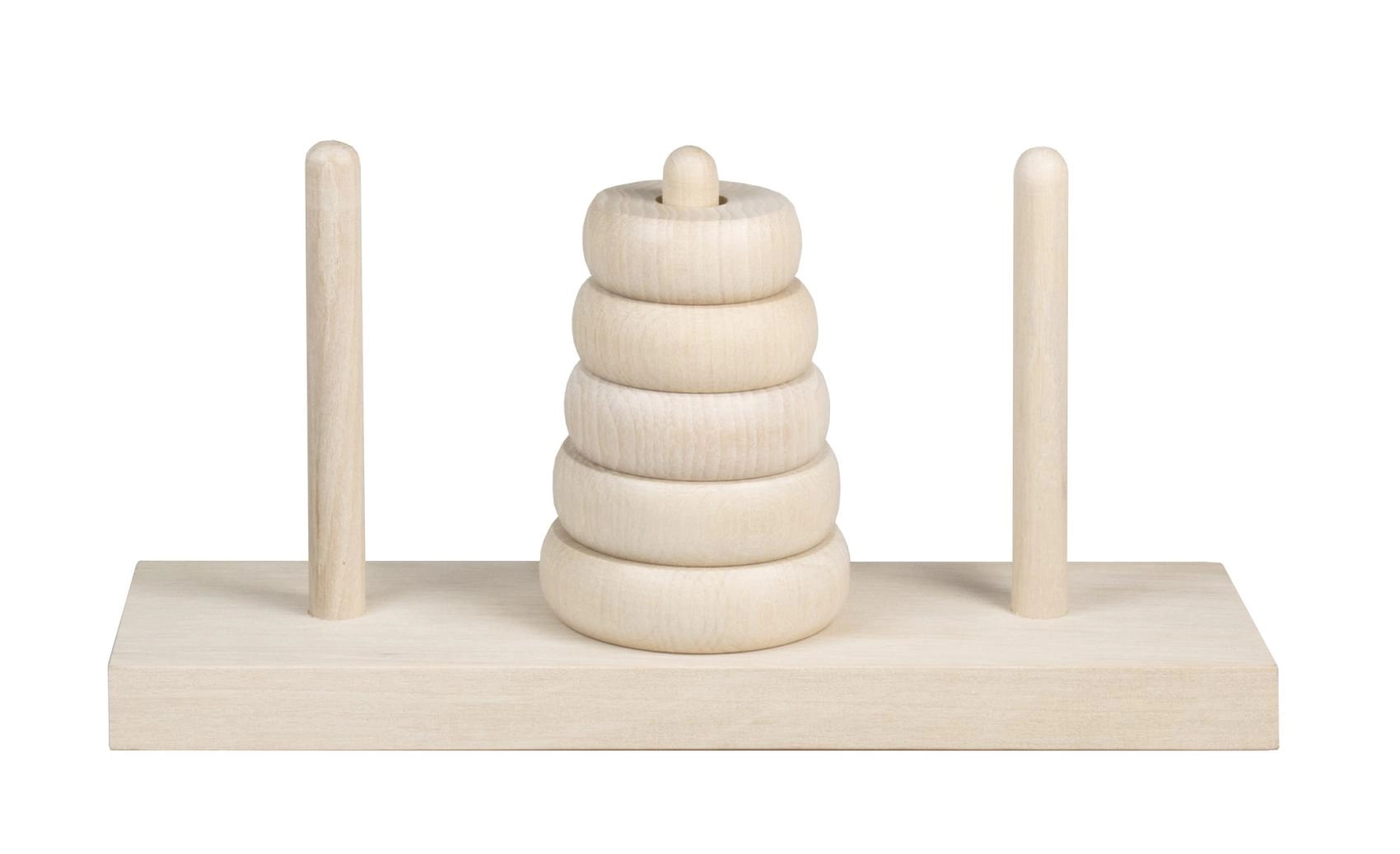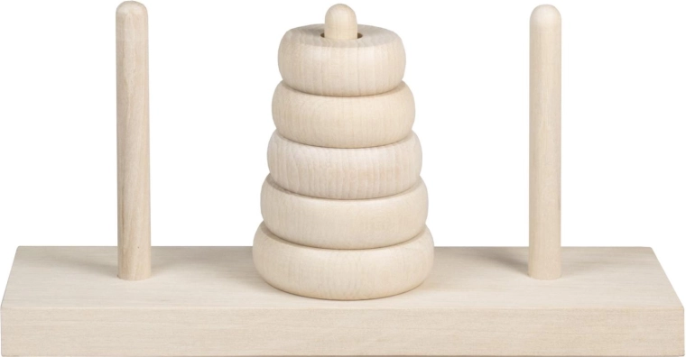 Hanojská věž je klasický matematický hlavolam z roku 1883, který baví i učí generace hráčů. Cílem je přesunout všechny kroužky z jedné tyčky na druhou podle jednoduchých pravidel – vždy lze přesunout pouze jeden kroužek a větší kroužek nikdy nesmí ležet na menším. Tato dřevěná verze nabízí přirozený vzhled, pevnou základnu a hladké kroužky pro pohodlné manipulování.