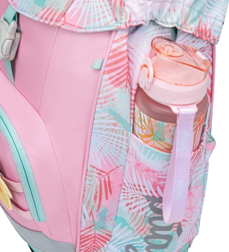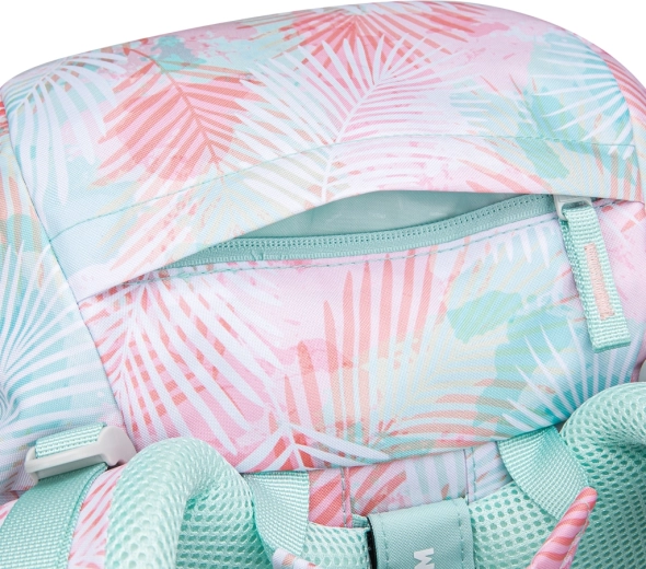 Praktické členění prostoru zahrnuje hlavní komoru s organizérem, lehké ochranné desky pro sešity a přední termo kapsu na svačinu, která udrží potraviny déle čerstvé. Prodyšné polstrování, nastavitelné ramenní popruhy, hrudní popruh i odnímatelný bederní pás podporují stabilitu a zdravé držení těla. Bezpečnost zvyšují reflexní prvky a odolnost zajišťuje voděodolný recyklovaný materiál s certifikací GRS.