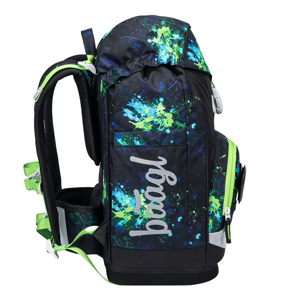 Vnitřní členění zajišťuje hlavní komoru s organizérem a lehké plastové desky chránící sešity. Přední termo kapsa udrží svačinu déle čerstvou a brání šíření pachů. Materiály jsou recyklované a voděodolné, s důrazem na bezpečnost díky reflexním prvkům. Design s vyměnitelnými odznáčky (Baaglies) umožní dětem batoh snadno personalizovat. Součástí setu je prostorný jednopatrový penál se dvěma chlopněmi (bez náplně), sáček na obuv či kroužky s karabinkou pro připnutí k batohu, praktická zástěra/přesník pro přezutí či ochranu a peněženka na krk na kapesné a doklady.