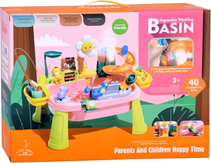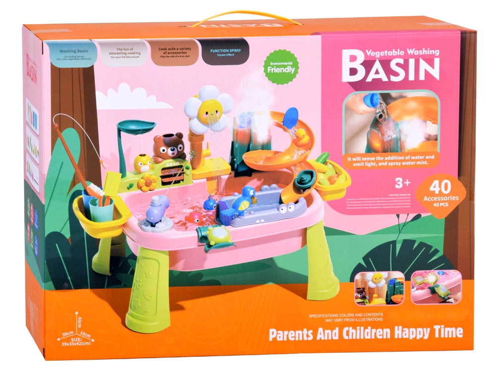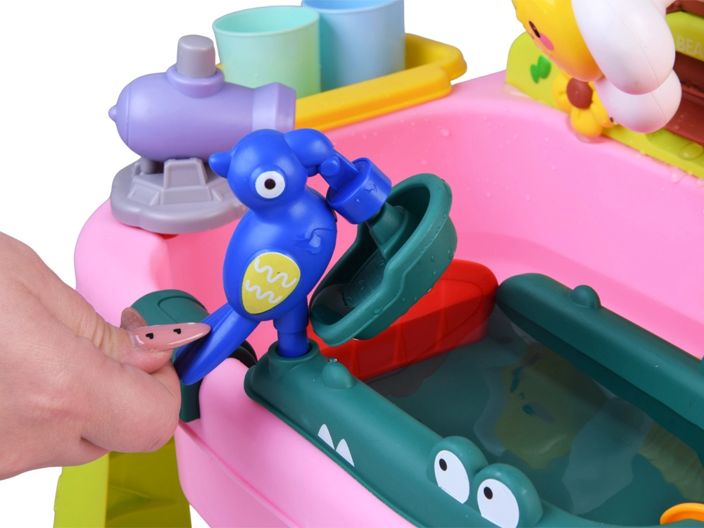 Součástí je bohatá sada cca 40 dílů: roztomilé figurky zvířátek, lodička, rybky s prutem, kelímky, „ovoce a zelenina“ k mytí a další příslušenství. Postranní přihrádky udrží vše po ruce a pomáhají udržet pořádek.