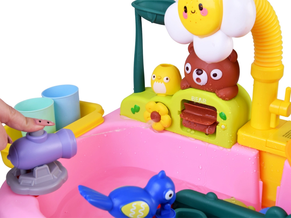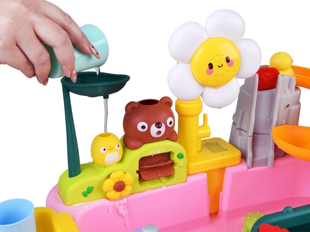 Tento interaktivní vodní stolek přináší dětem spoustu možností her s vodou: nalévání, stříkání, rybaření i pouštění lodiček. Květinový sprškový nástavec dodá hře realistický vodní efekt a zábavné kanálky a kolečka ukazují, jak voda uvádí prvky do pohybu.