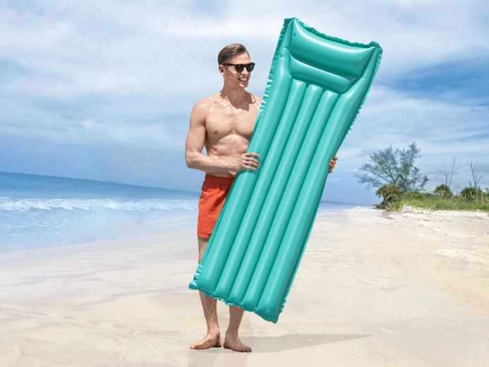 Odolný materiál PVC se vyznačuje dlouhou životností a odolností proti oděru, takže lehátko bez problémů zvládne celou sezónu. Po vyfouknutí je kompaktní, snadno se vejde do plážové tašky či batohu a díky jednoduchému ventilu jej rychle připravíte k použití.