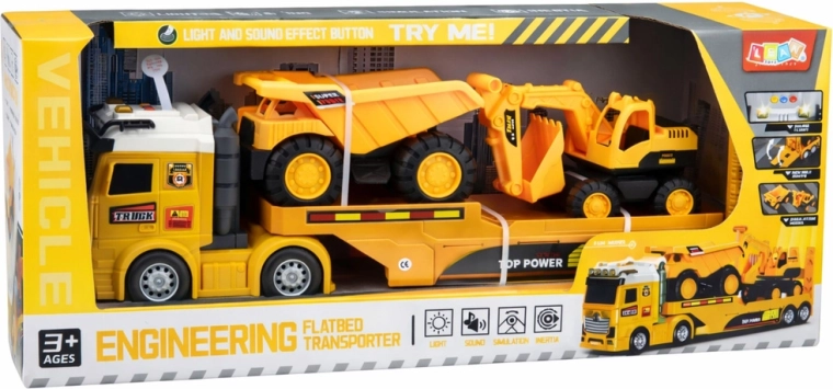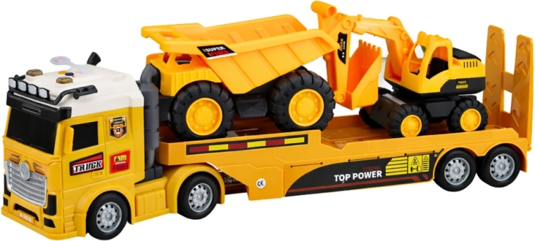 Tento detailně zpracovaný set umožní malým stavitelům převážet stroje na místě stavby, kopat, nakládat i vyklápět materiál. Kamion s návěsem uveze bagr i sklápěčku, takže děti mohou snadno přehrávat různé scénáře od převozu techniky až po práce na stavbě. Světla a zvuky v kabině tahače dodávají hře realistickou atmosféru.