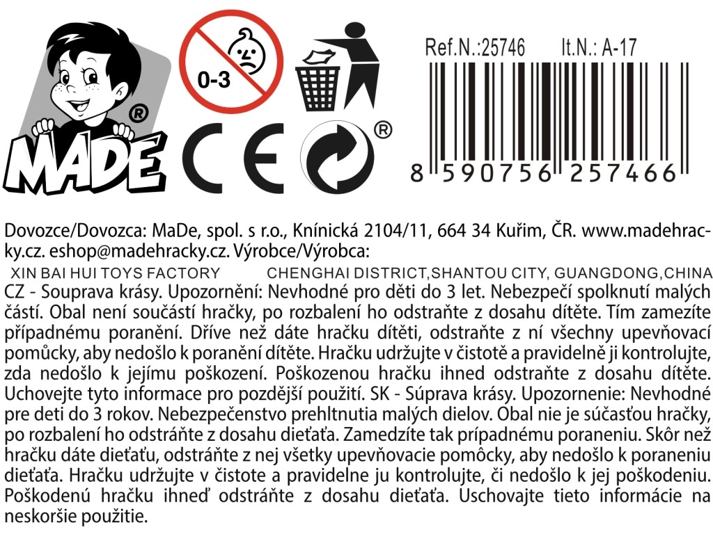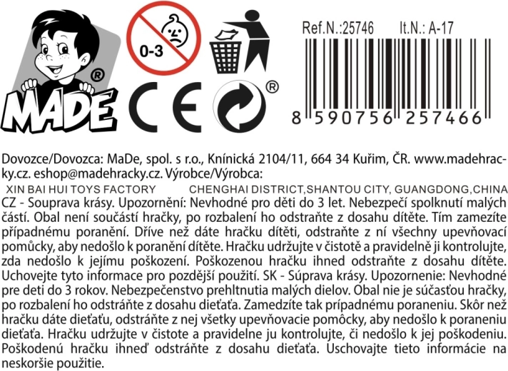 Potěšte malé parádnice touto dětskou soupravou krásy, ideální od 3 let. Kompaktní balení o rozměrech 14 × 20 × 3 cm, jednoduchý design a jedna barevná varianta zaručují snadné použití a spoustu radosti z hraní.
