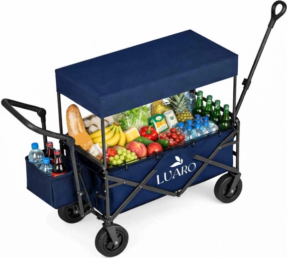 Univerzální skládací vozík LUARO s dáškem usnadní převoz věcí na pláž, kemp i do města. Díky robustní konstrukci, širokým terénním kolům, otočným předním kolečkům a regulovatelným rukojetím se snadno ovládá. Praktická stříška chrání obsah před sluncem a lehkým deštěm, boční kapsy a koš zajišťují přehledné uložení nezbytností.