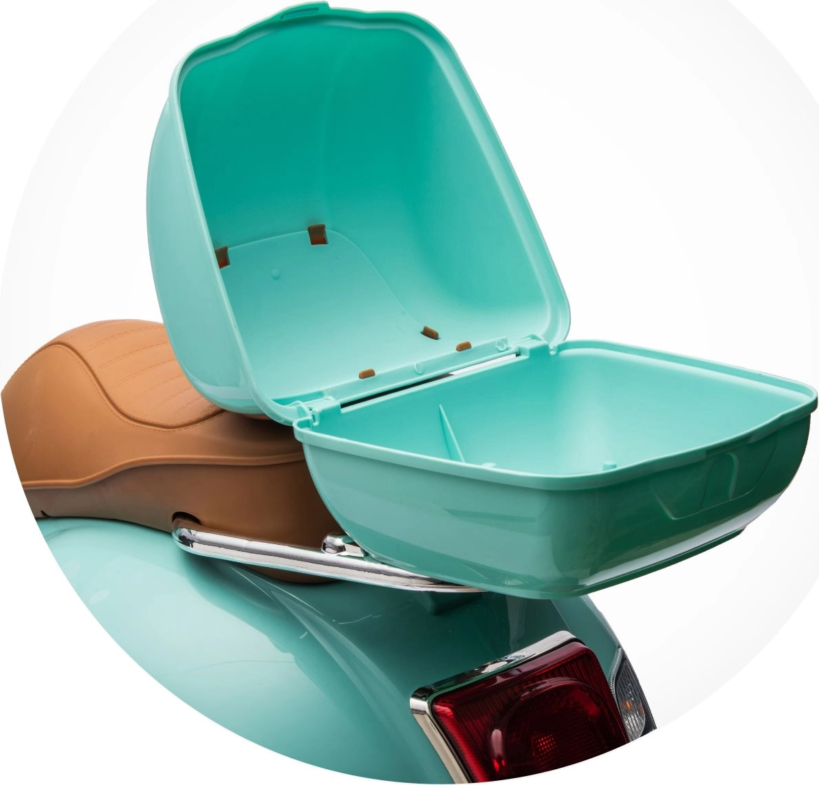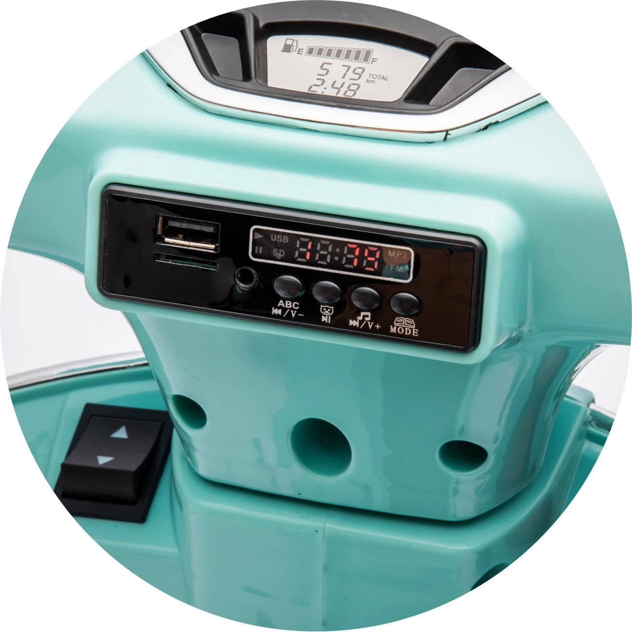 Stylová dětská elektrická motorka inspirovaná ikonickou VESPA GTS potěší malé jezdce realistickým vzhledem i bezpečnou jízdou. Nabízí dva motory 2 × 30 W, stabilizační kolečka, LED světla, pohodlné sedadlo z eko kůže a hudební panel s USB/TF/MP3/AUX. Součástí je i zadní úložný box a světelné i zvukové efekty pro ještě větší zábavu.