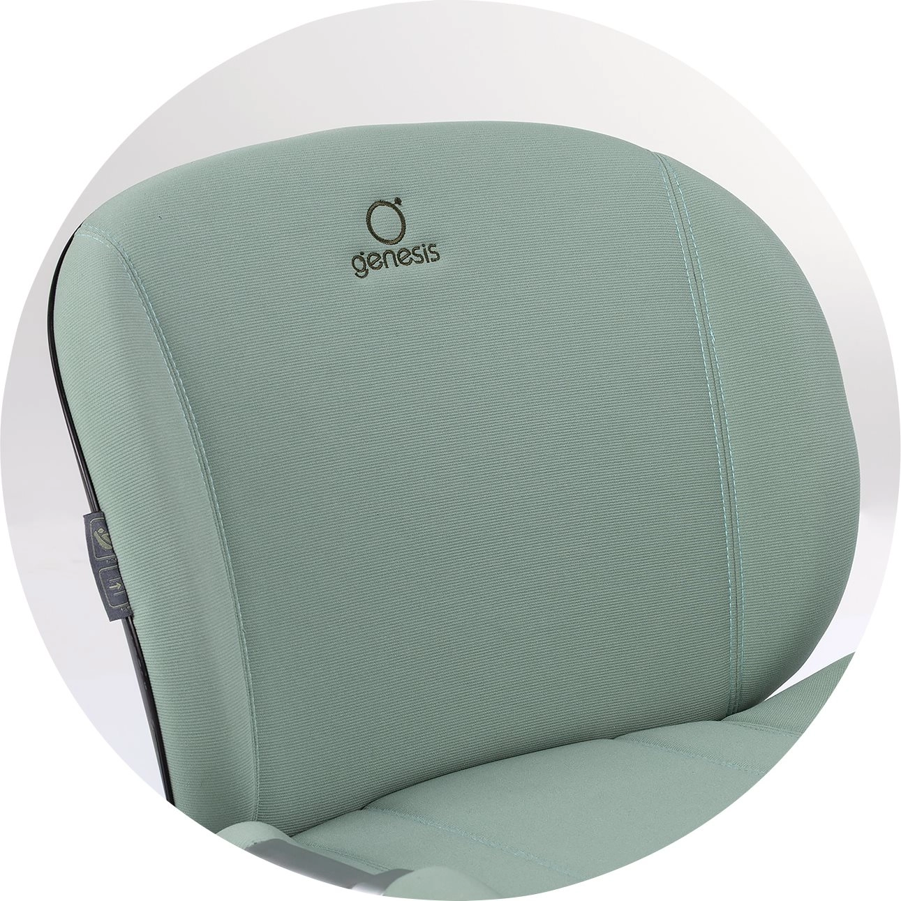 Měkké polstrování, loketní opěrky a odnímatelná prodyšná opěrka zad. Elegantní detaily v kovovém provedení a potah v barvě Matcha.