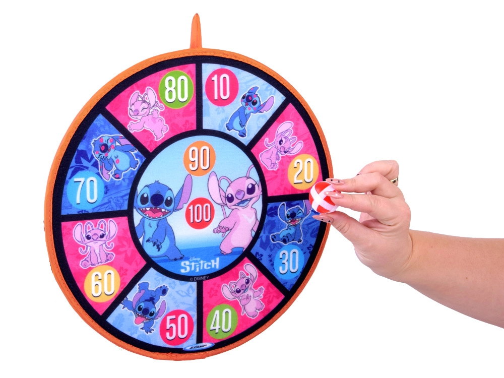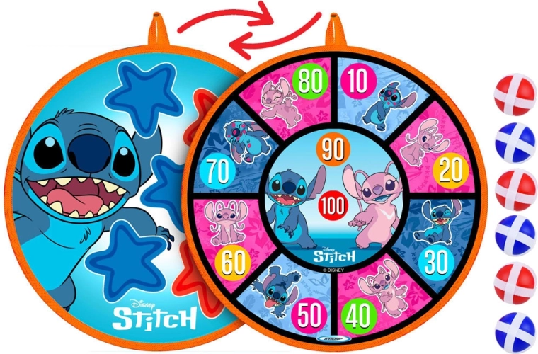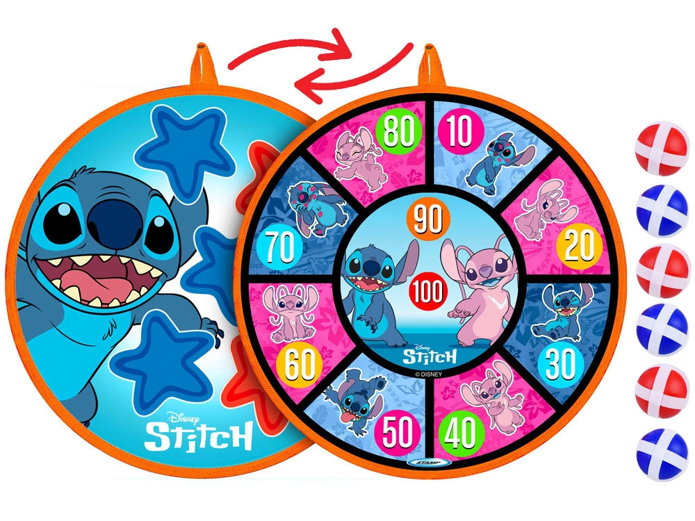 Oboustranný terč na suchý zip se stylovou grafikou STITCH přináší skvělou pohybovou zábavu pro děti různého věku. Díky měkkému povrchu a lehkým míčkům je hra bezpečná a vhodná do interiéru i na čerstvý vzduch. Terč lze snadno zavěsit a během chvilky připravit k soutěžím i tréninku přesnosti.