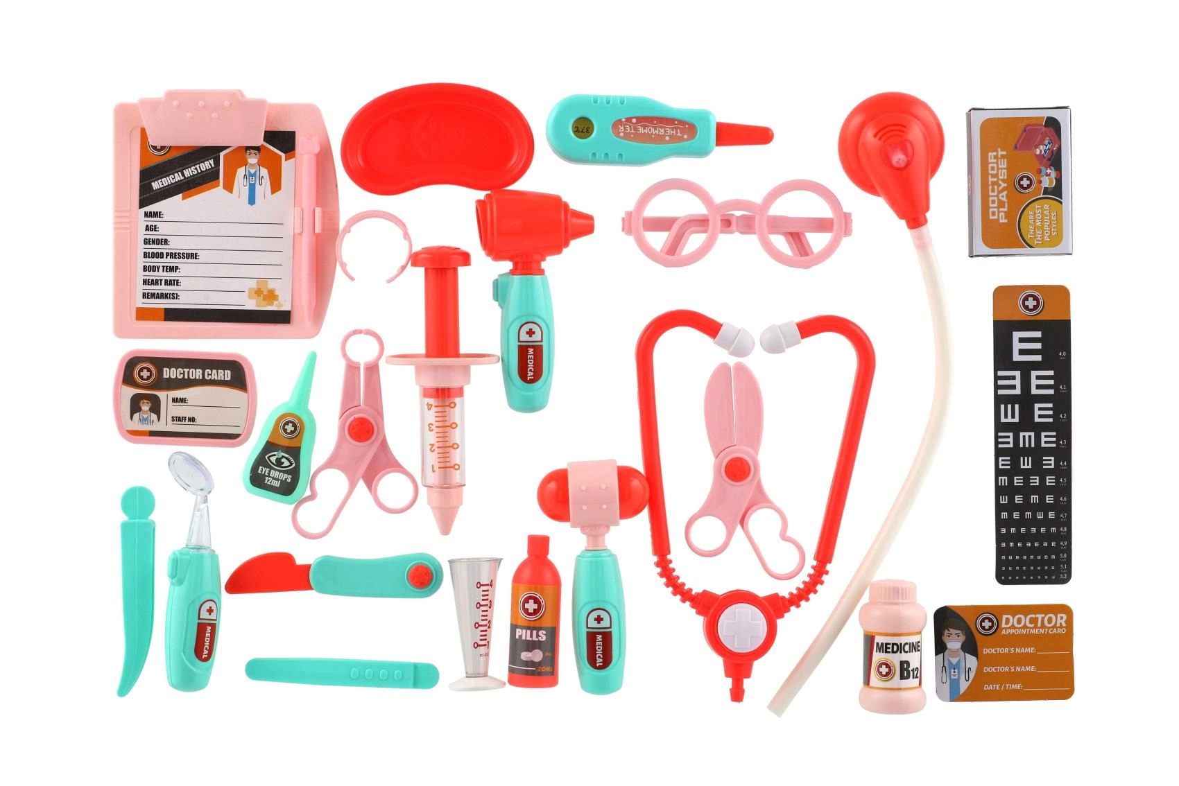 - Stetoskop, injekce, otoskop, teploměr, nůžky, kladívko, brýle, pinzeta, lahvičky na „léky“, kartičky a další doplňky