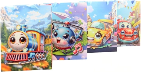 - Veselý motiv – barevné dopravní prostředky pro radostné předání dárku
