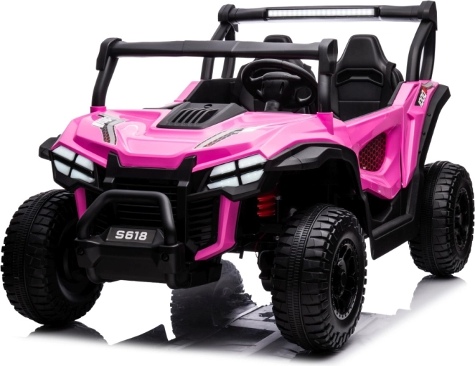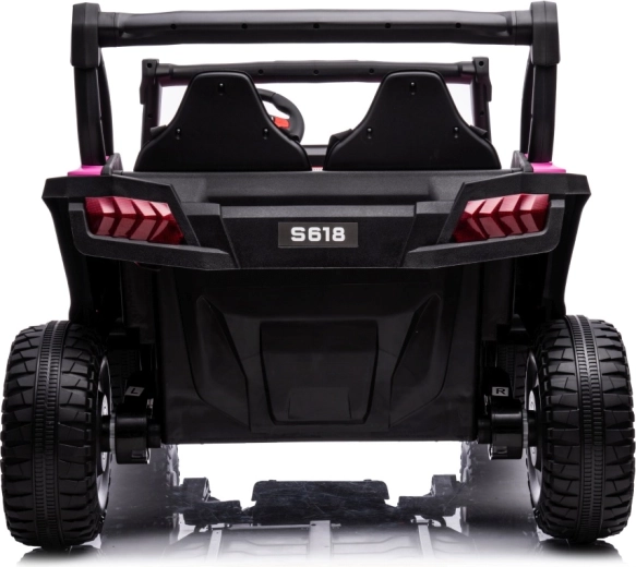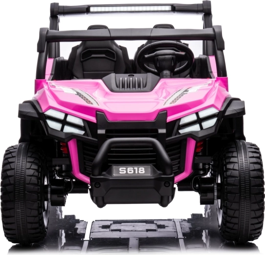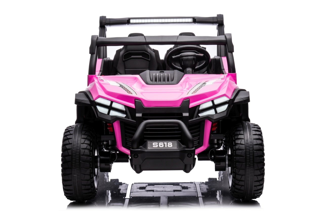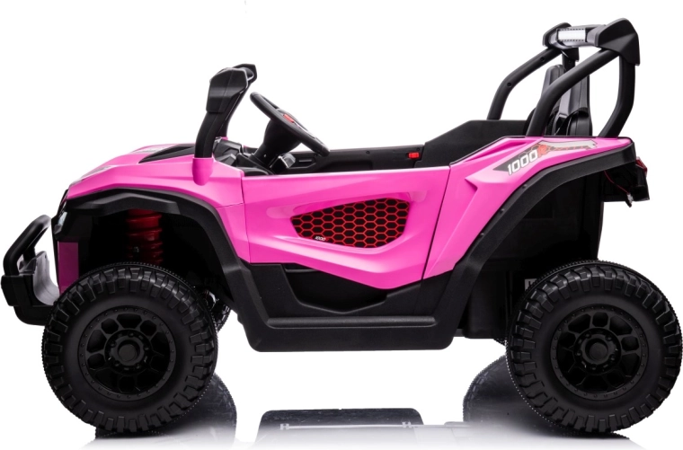 Buggy Gravity 4x4 v růžové barvě je robustní elektrické vozítko pro děti, které kombinuje výkon, pohodlí a bezpečnost. Dva výkonné motory 2×80 W napájené baterií 24 V 7 Ah poskytují jistý záběr i na nezpevněných cestách, zatímco velká pěnová EVA kola (34×13 cm) a zadní odpružení zvyšují komfort a stabilitu. Ovládání usnadňuje plynulý rozjezd, volba 2 rychlostí a jízda vpřed/vzad.