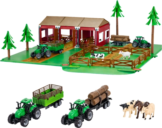 Dva traktory a dvě přívěsné vozíky umožní převážet dřevo i další náklad a realisticky napodobovat práce na farmě. Detailní zpracování budov, plotů a kabin traktorů z kvalitního plastu zajišťuje odolnost a poutavý vzhled.