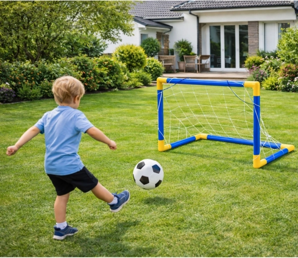 Lehká a stabilní dětská fotbalová branka s kompletním příslušenstvím – míč, pumpička a síť – pro zábavný trénink doma i venku. Snadná montáž, odolné plastové trubky a kompaktní rozměry podporují pohyb, koordinaci a přesnost střelby.