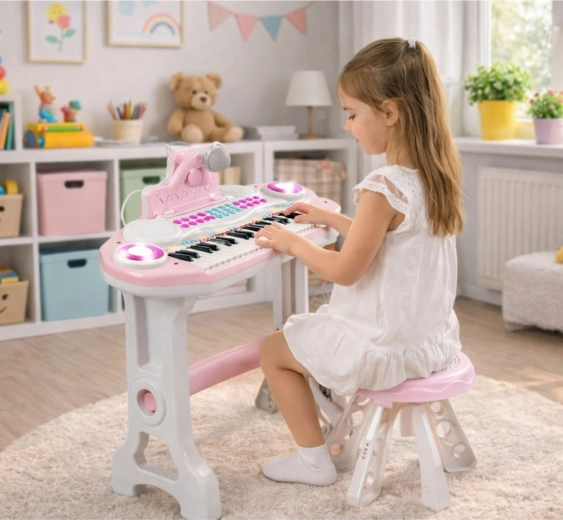 Rozvíjejte hudební talent vašeho dítěte s růžovými elektronickými klávesami s 37 klávesami, mikrofonem a funkcí MP3. Nabízejí zábavné rytmy, různé nástroje, nahrávání a přehrávání, regulaci tempa i hlasitosti a světelné efekty LED. Součástí je stolek, taburet a stojánek na noty pro pohodlné hraní.