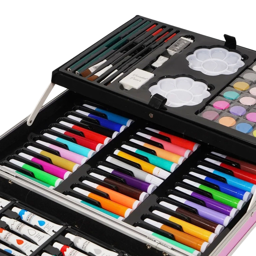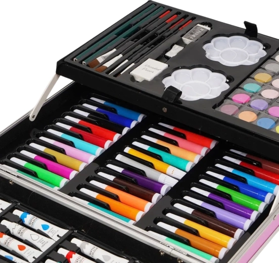 Sada obsahuje pestrou paletu pastelek, fixů, pastelek, akvarelových barev, štětců a dalších doplňků – dokonale uspořádaných v přehledných patrech kufříku.