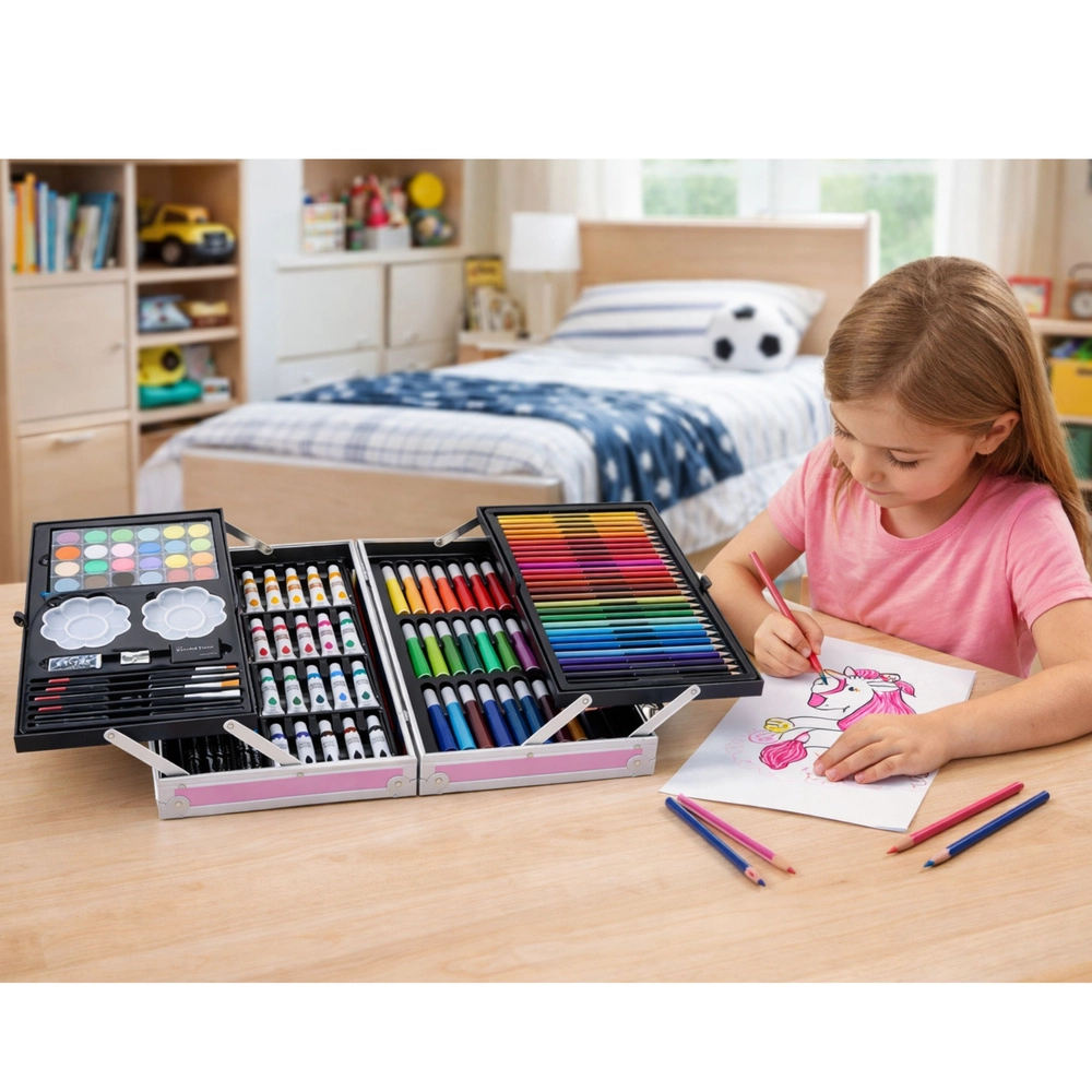 Kompletní výtvarná sada pro děti v růžovém kufříku s motivem jednorožce nabízí až 150 dílů pro kreslení, malování a tvoření. Praktický kufřík s pevným uzavíráním a rukojetí udrží všechny potřeby přehledně uspořádané a připravené na cestování, školu i kroužky.