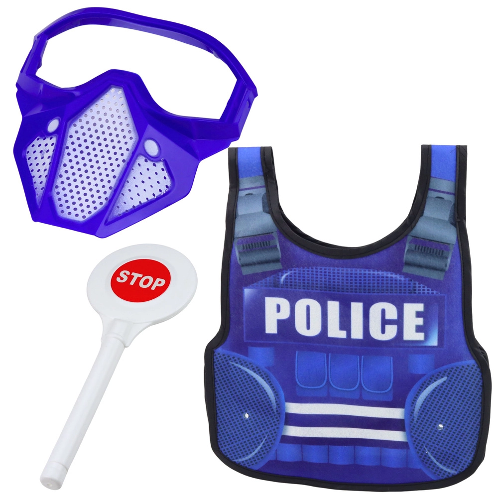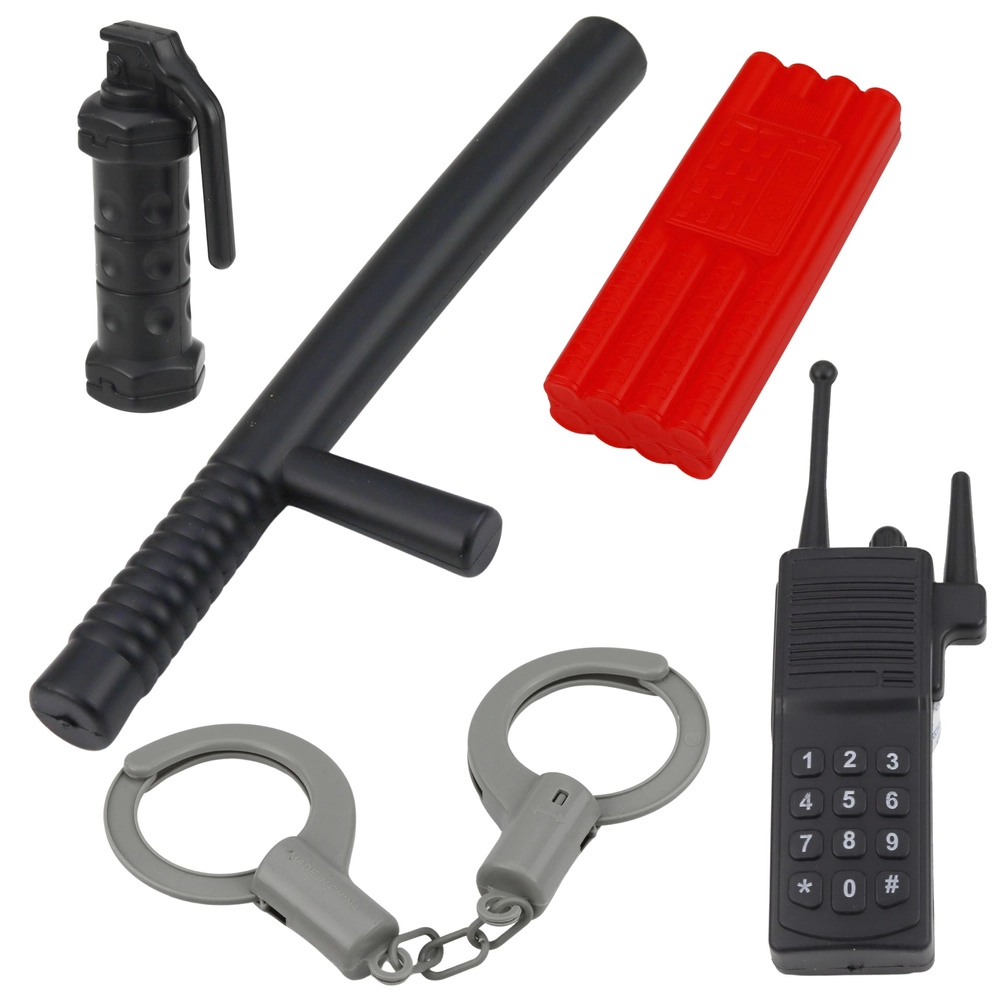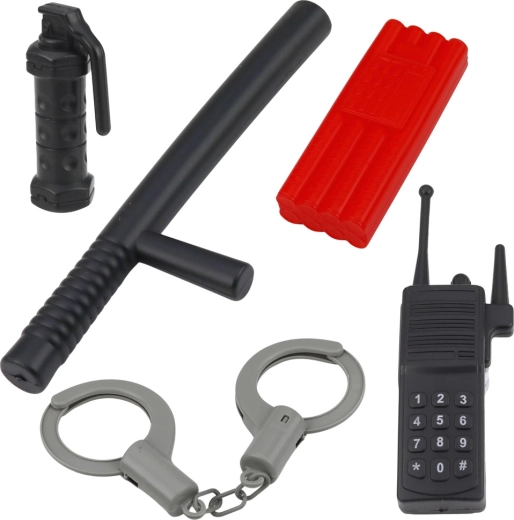 Součástí jsou realistické doplňky z odolného plastu: hračka pistole, kajdanky, vysílačka, obušek, značka STOP a ochranné brýle/maska. Děti si bezpečně vyzkoušejí týmovou spolupráci, komunikaci a pravidla silničního provozu.