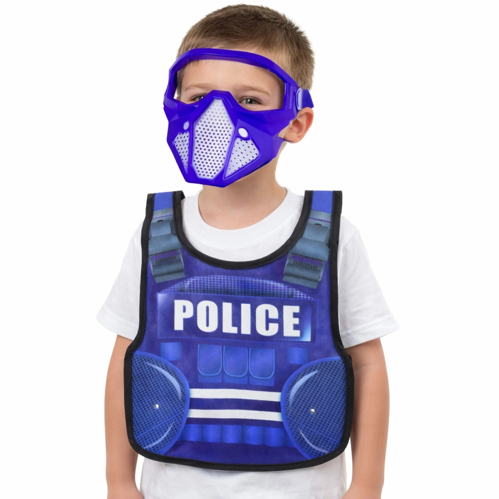 Kompletní dětský policejní set pro malé strážce pořádku. Obsahuje lehkou vestu s nápisem POLICE, pistolí na hraní, kajdanky, krátkovlnnou vysílačku, obušek, značku STOP a ochranné brýle/masku. Ideální pro kreativní hraní rolí, rozvoj fantazie a bezpečnou akční zábavu doma i venku.