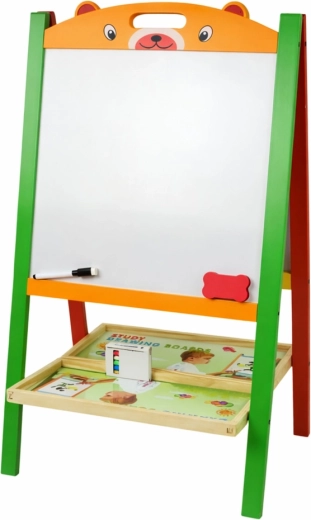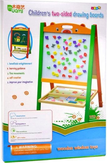 Robustní rám z přírodního dřeva je stabilní a bezpečný, bez ostrých hran. Skládací stojan šetří místo při ukládání. Součástí balení je vše potřebné k okamžitému použití – magnety, mazací fix s gumou, křídy a houbička.