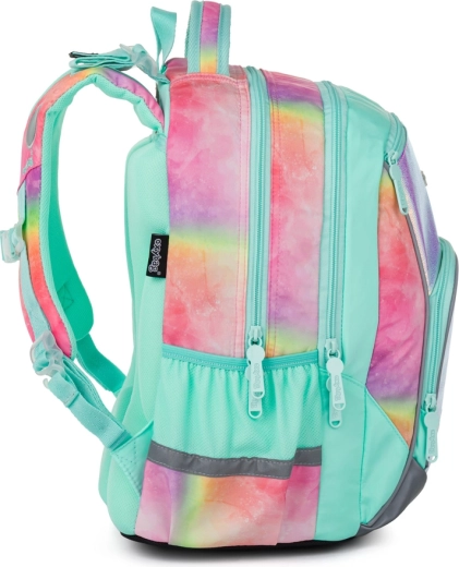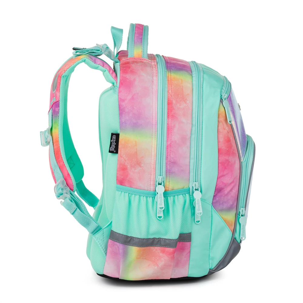 Promyšlené členění nabízí dvě hlavní vnitřní kapsy na učebnice a sešity, praktické menší kapsy na drobnosti i boční kapsy – jednu otevřenou na láhev a druhou na zip pro bezpečné uložení. Reflexní prvky zvyšují viditelnost dítěte za šera i deště.