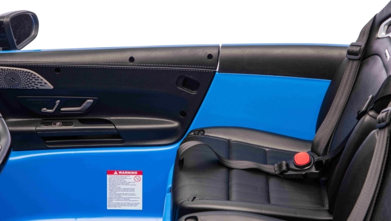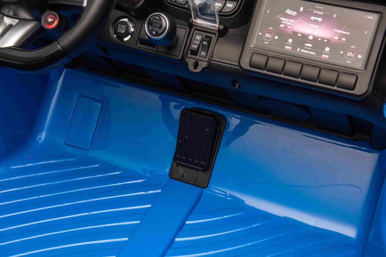 Interiér potěší dvěma sedadly z eko kůže s bezpečnostními pásy, realistickou palubní deskou a multimediálním panelem s MP3, USB, Bluetooth, AUX a FM rádiem. Díky otevíracím dveřím, LED světlům vpředu i vzadu a funkci soft start je jízda bezpečná a maximálně realistická. Rodiče mají vše pod kontrolou díky ovladači 2,4 GHz se třemi rychlostmi a nouzovým STOP.