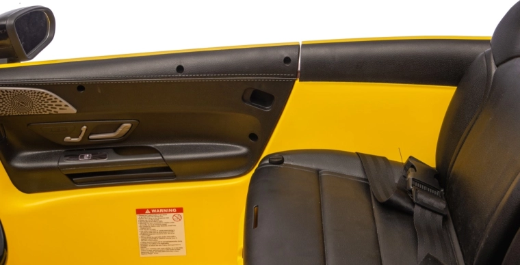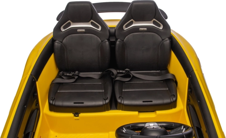 Interiér s dvěma sedadly z eko kůže (každé cca 27×21×33 cm) a bezpečnostními pásy potěší malé řidiče i spolujezdce. Realistický zážitek dotváří otevírací dveře, LED osvětlení vpředu/vzadu a palubní audio panel s MP3, USB, Bluetooth, AUX i FM rádiem; k dispozici jsou i tlačítka zvuků a klakson na volantu a ukazatel stavu nabití.