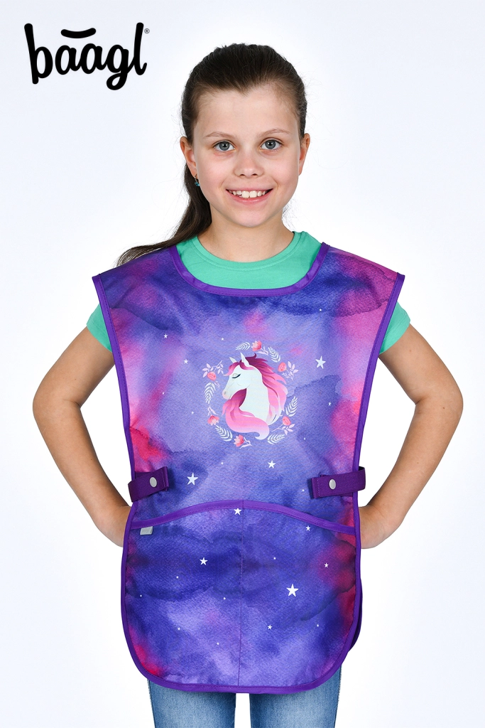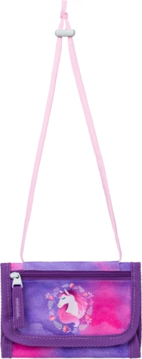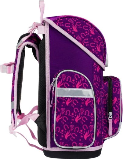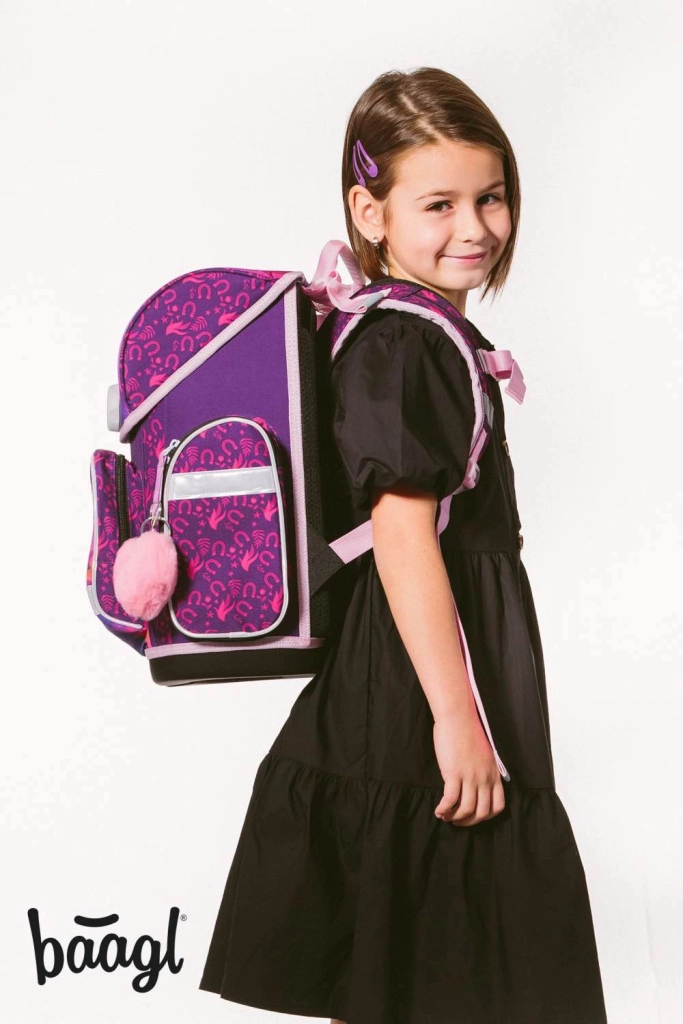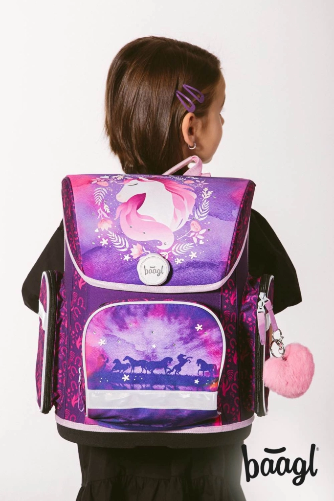 Kompletní školní výbava pro malé školáky s motivem KŮŇ v kouzelných fialovo-růžových barvách. Set obsahuje ergonomickou aktovku s nastavitelným zádovým systémem, lehký sáček na obuv, dvouchlopňový penál, omyvatelnou zástěru a peněženku na krk. Bezpečnost zajišťují reflexní prvky, pohodlí prodyšná záda a snadné ovládání magnetického zapínání Fidlock.