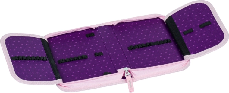 Praktická výbava zahrnuje izolovanou přední kapsu, dvě boční kapsy na láhev, vnitřní organizér a průhlednou kapsu s rozvrhem. Zbytek setu doplňuje sáček na obuv se stahováním, klasický penál se dvěma chlopněmi, omyvatelná výtvarná zástěra se dvěma kapsami a peněženka na krk s bezpečnostní pojistkou a samostatnou kapsičkou na drobné.