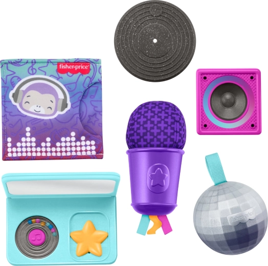 Pískací mikrofon, disco chrastítko, silikonový „reproduktor“, kousátko–deska a šuštivý obal tvoří zábavnou sadu inspirovanou hudbou pro smyslové zkoumání a hraní rolí.