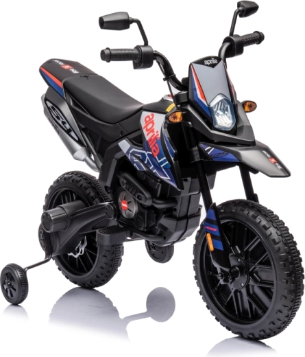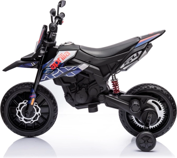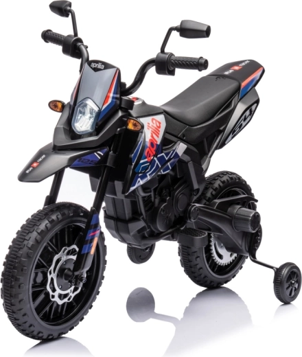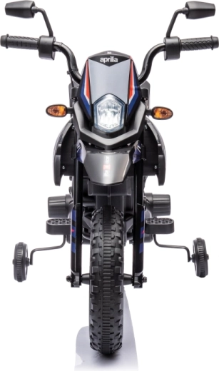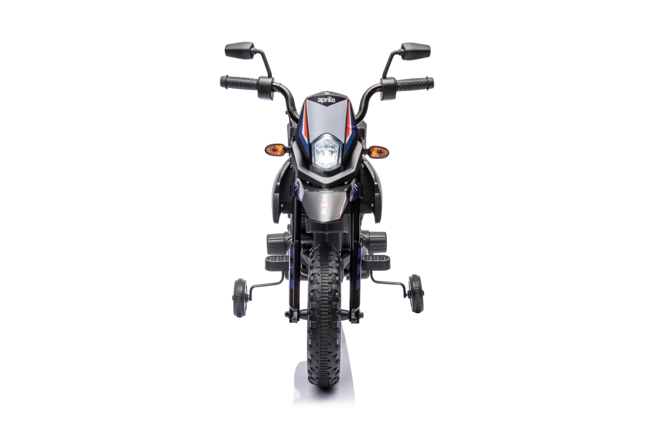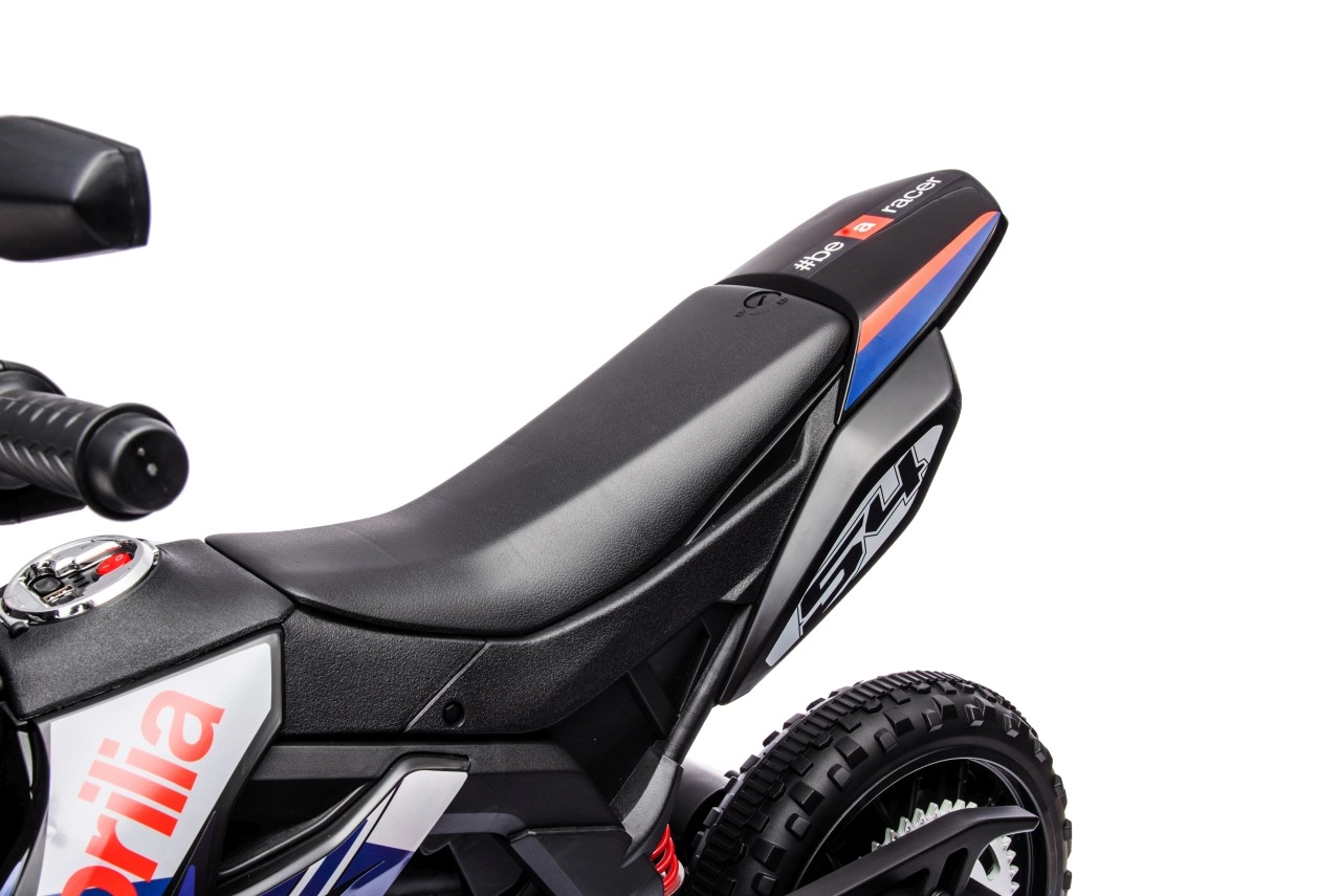 Dětská elektrická motorka APRILIA RX v modré barvě kombinuje realistický design terénního stroje s bezpečnými funkcemi pro začínající jezdce. Dva motory 35 W a akumulátor 12 V / 7 Ah zajistí plynulý rozjezd a dostatek síly, zatímco boční kolečka pomáhají držet stabilitu.