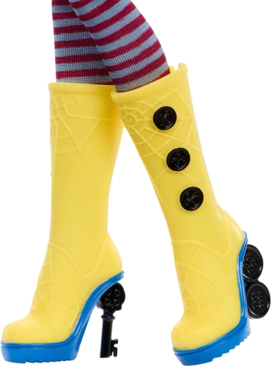 Lesklý žlutý plášť s knoflíky, pruhované ponožky a vysoké boty s pavoučími motivy věrně zachycují styl CORALINE a dodají sbírce výrazný centerpiece.