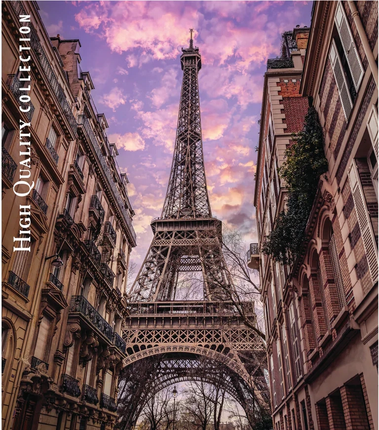 Detailní záběr Eiffelovy věže mezi pařížskými domy v jemném růžovém svítání dodá interiéru nádech elegance a cestovatelské atmosféry.