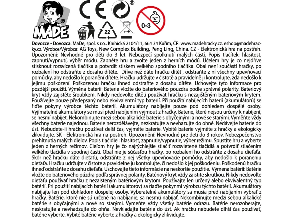 Kompaktní kapesní elektronická hra přináší rychlou zábavu a výzvy pro děti od 6 let. Díky rozměrům 13,5 × 7,5 cm se snadno vejde do ruky i batohu, je vyrobena z odolného plastu a napájí se pomocí 3× AAA baterií. Skvělá volba na cesty, do školy i domů.